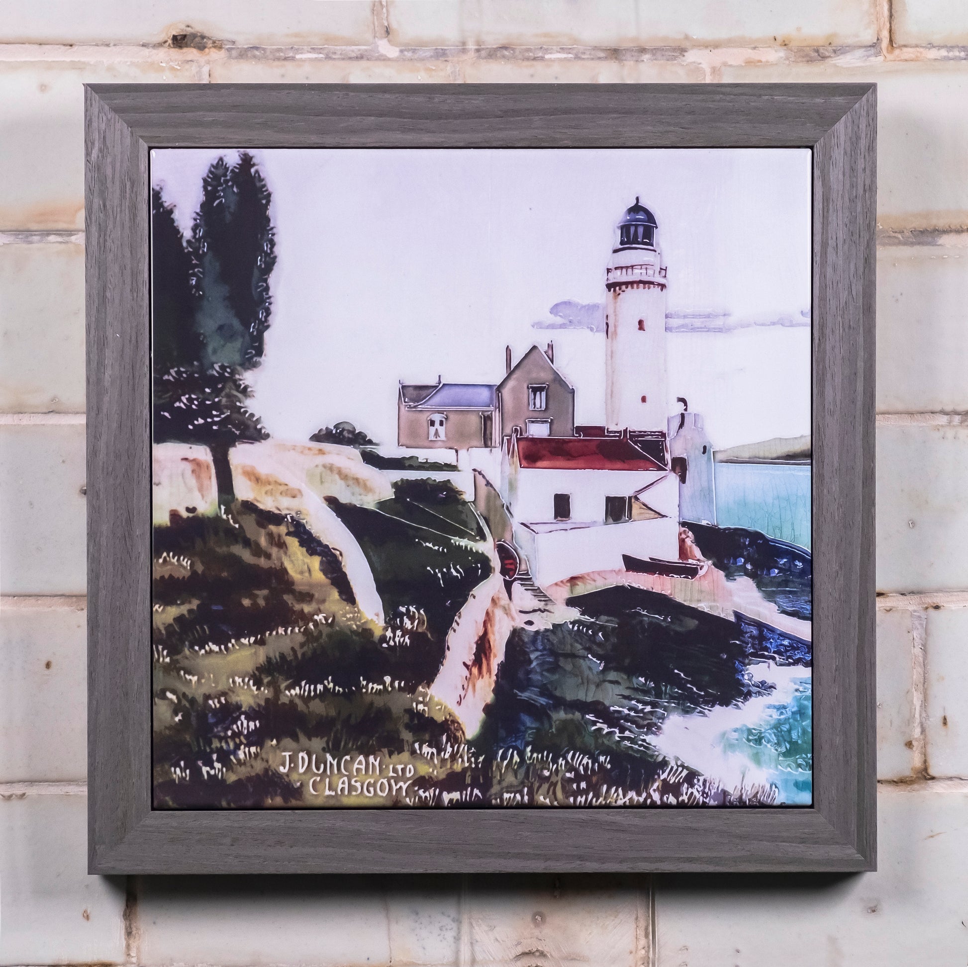 This is a framed digital print on a ceramic tile .
